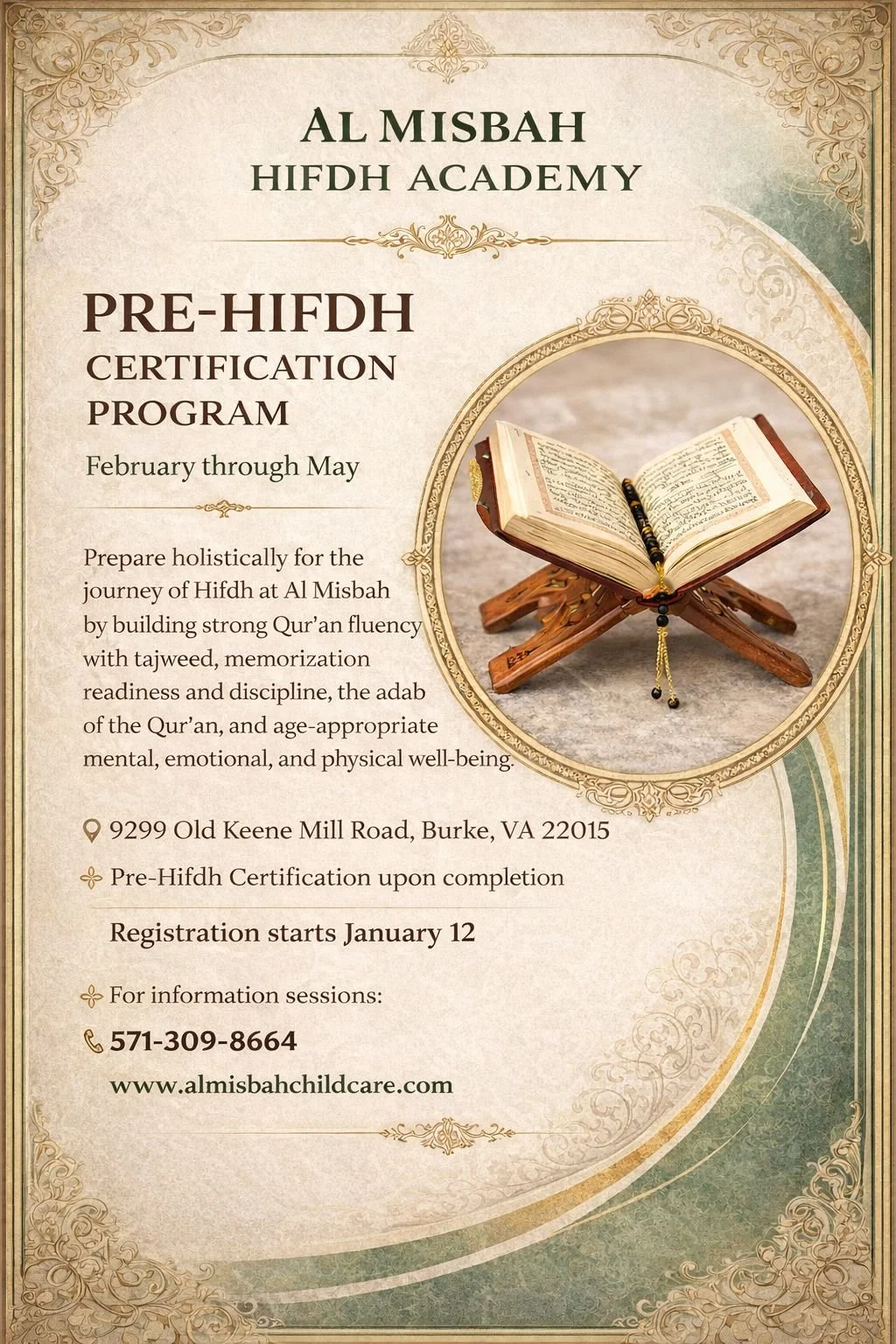 Alhamdulillah, Al Misbah Hifdh Academy is offering a Pre-Hifdh Certification Program for students who are intending to begin their Hifdh journey in Fall 2026.